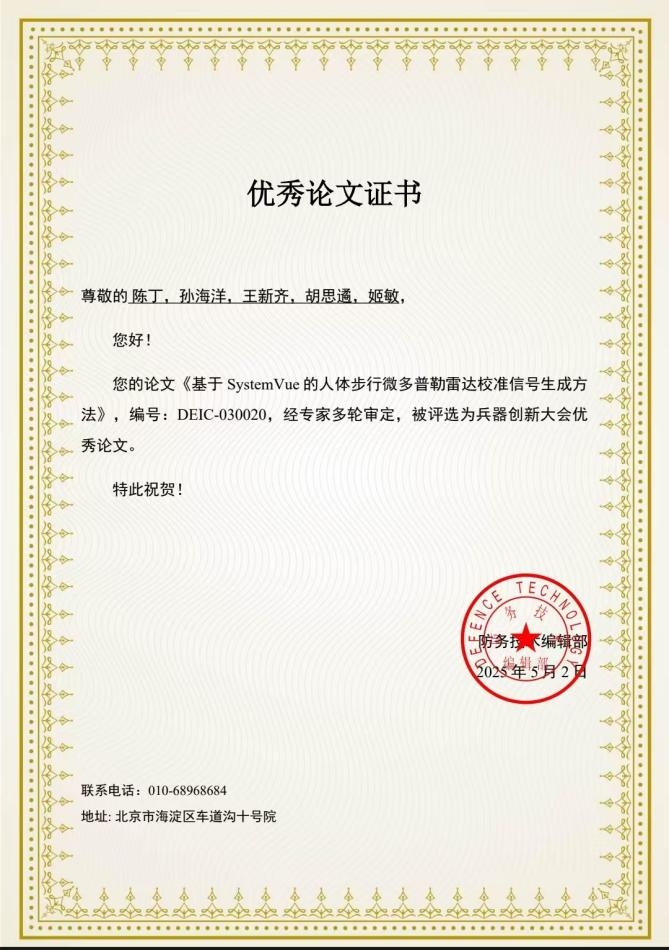 会后,经专家多轮审定,公司23级兵器科学与技术学科硕士研究生孙海洋(第二作者兼通讯作者)撰写的《基于SystemVue的人体步行微多普勒雷达校准信号生成方法》,被评选为兵器创新大会优秀论文。