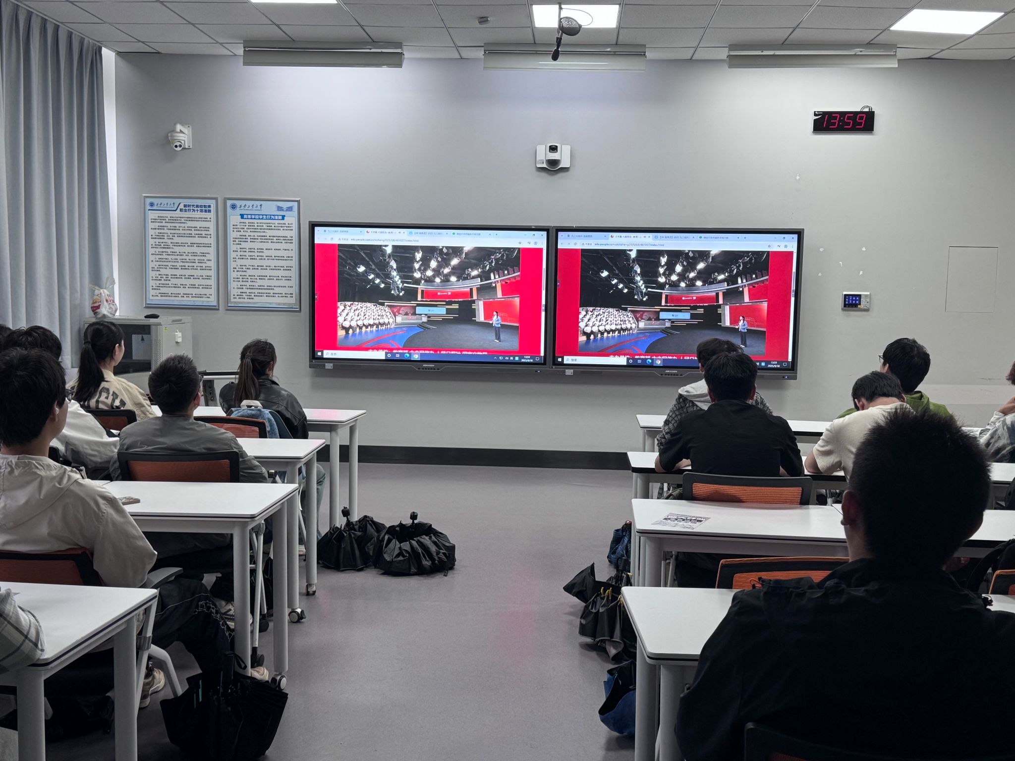 课堂上,授课嘉宾以鲜活案例、深刻论述,从历史传承、时代使命、青年担当等维度,结合文物背后的红色故事、新时代发展成就,为学子们阐释了新时代青年应有的理想追求与责任使命。同学们通过电子白板实时观看,认真记录笔记,在课堂互动环节积极留言,分享学习感悟。